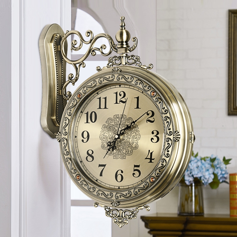汉时(Hense)欧式轻奢双面钟客厅金属雕花石英时钟复古艺术装饰挂钟HDS18 ...