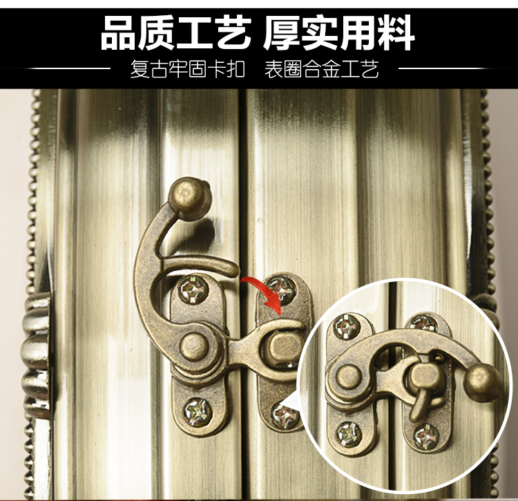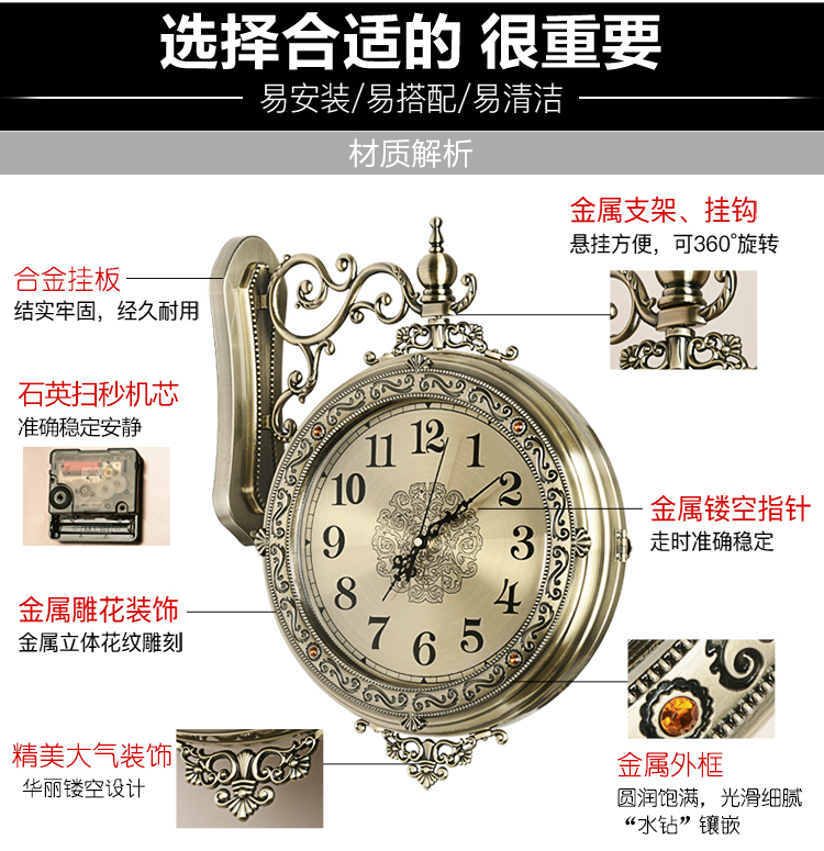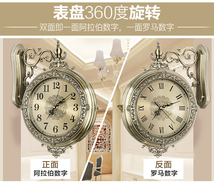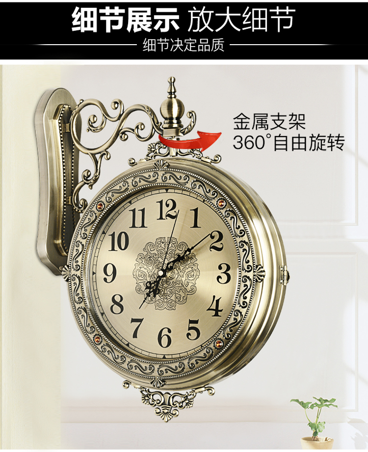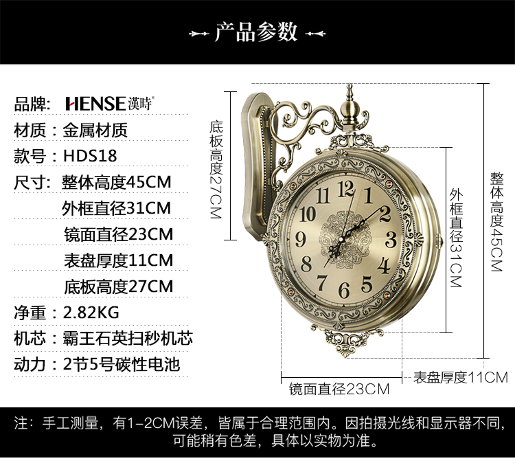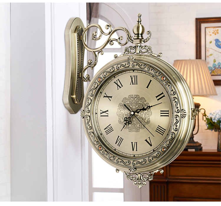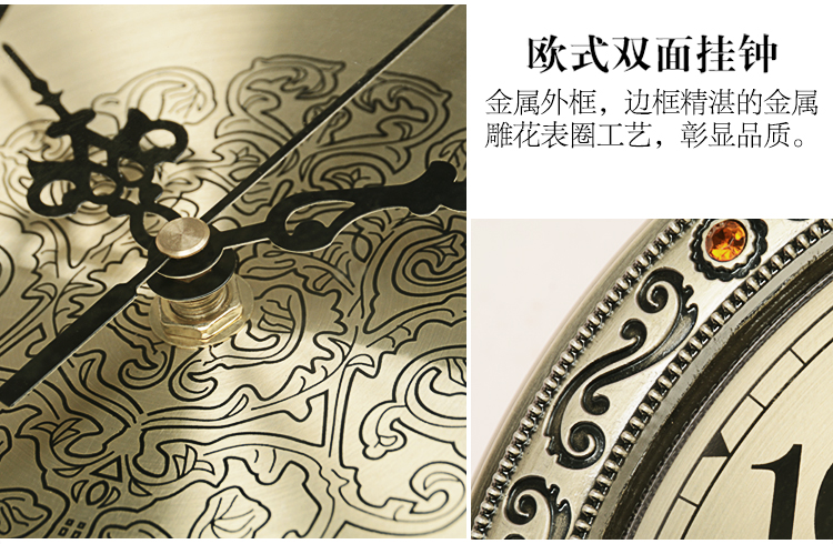 汉时(Hense)欧式轻奢双面钟客厅金属雕花石英时钟复古艺术装饰挂钟HDS18 青铜色